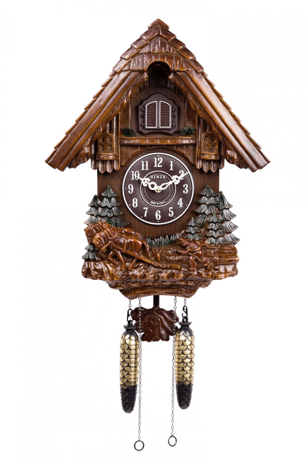 Оснащены надежным кварцевым механизмом. Корпус часов изготовлен из дерева, МДФ. Циферблат круглый черного цвета. Временные рамки обозначены арабскими цифрами. Гири сделаны из пластика, выполняют декоративную функцию.